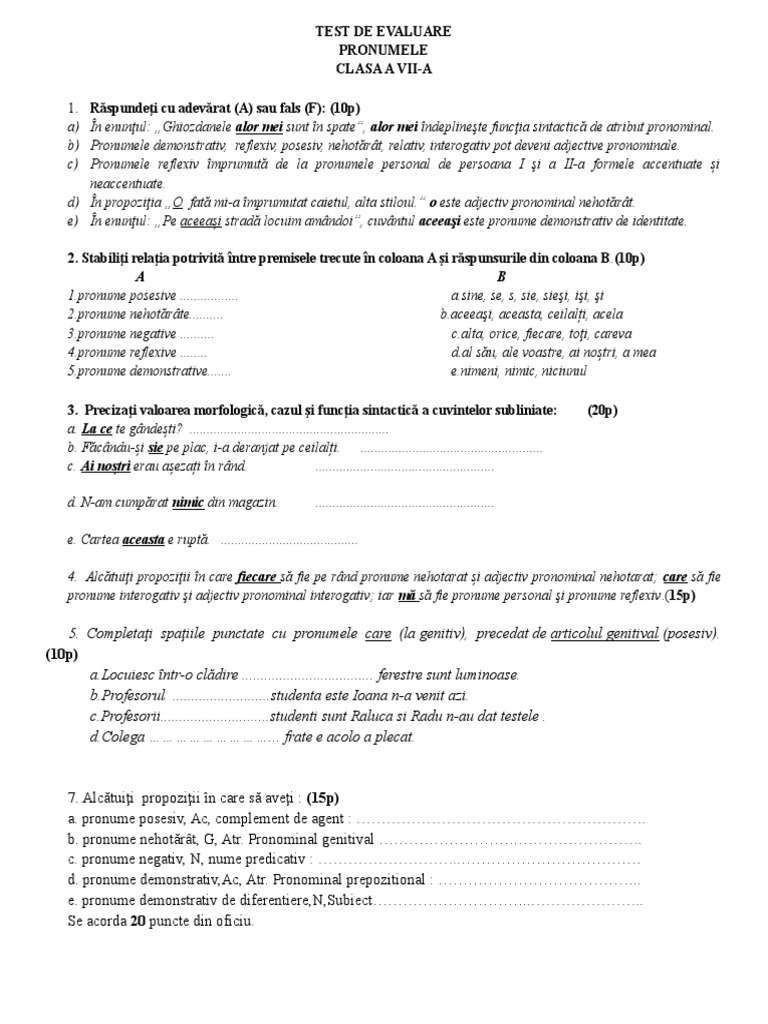 Test Pronumele Numeralul Clasa A Vii A 2019