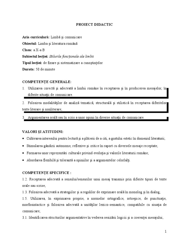 Proiect De Lectie Stilurile Functionale Ale Limbii Doc